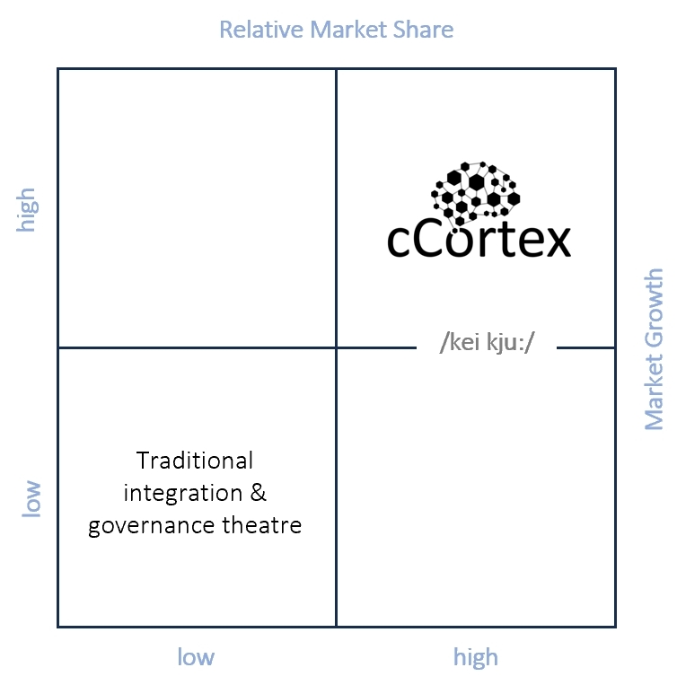 Instead of competing in the red ocean of ever more tools and governance layers, cCortex® creates a blue ocean: dramatically lower integration and governance overhead, with maximised AI-native readiness and organisational neuroplasticity.